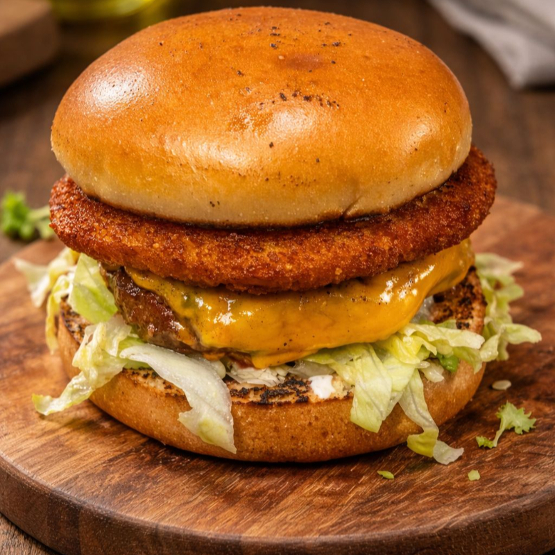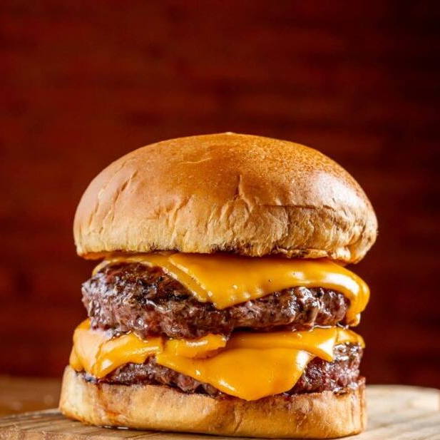 Pão brioche selado na brasa, duas carnes bovinas de 150g, cheddar duplo, alface e tomate