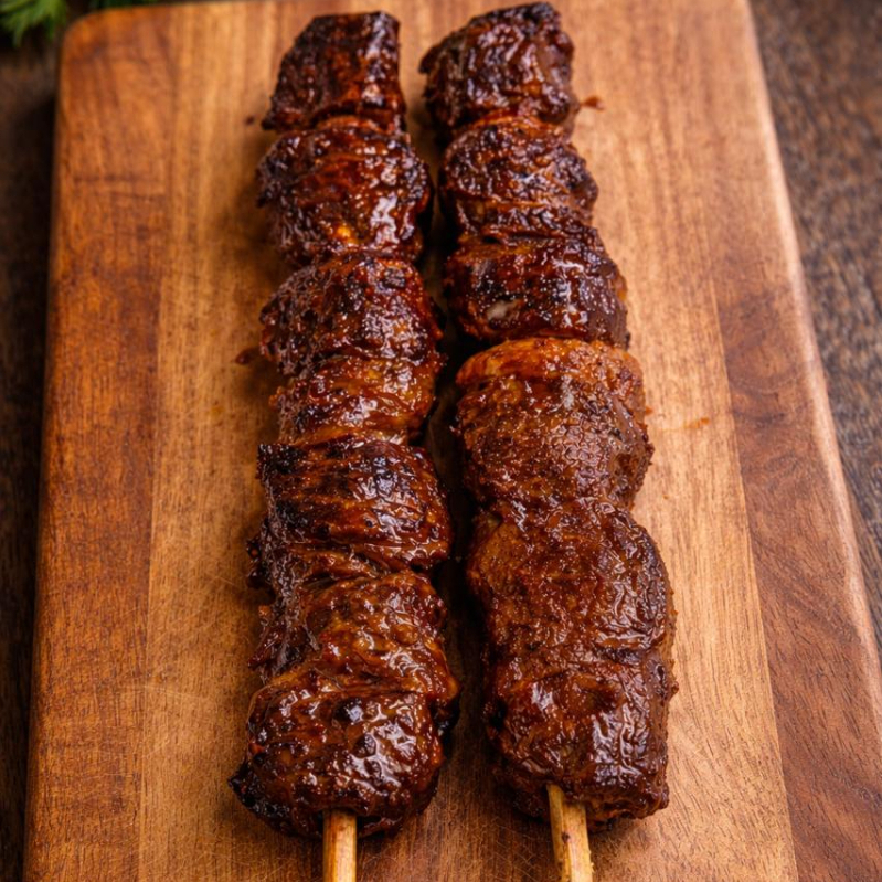 Espetinho de carne bovina selecionada, assado na brasa com sabor defumado irresistível. Preparado artesanalmente no Jocley Grill