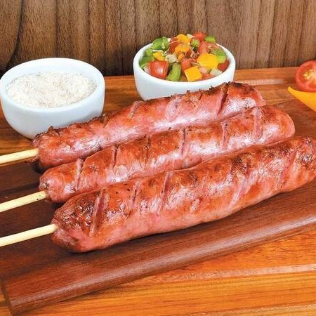 Arroz, branco soltinho Linguiça apimentada, vinagrete fresco, farofa temperada, maionese cremosa da casa,1 espeto de Linguiça suculento grelhado na brasa preparado na hora.