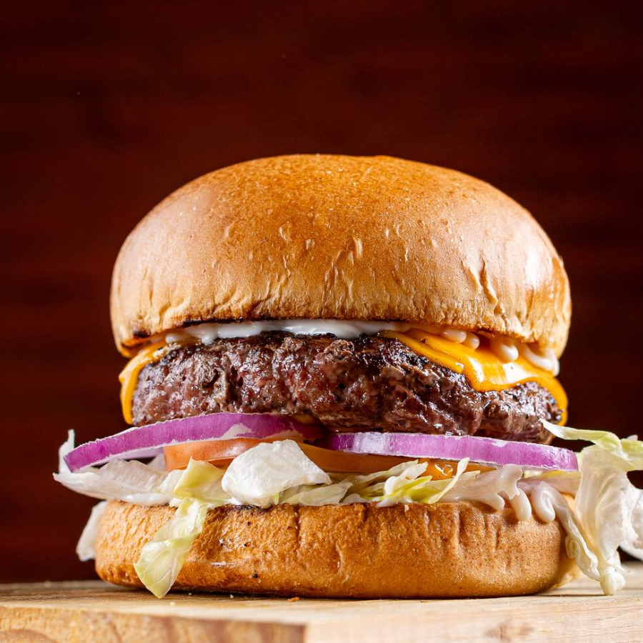 Pão brioche selado na brasa, carne bovina 150g, queijo cheddar, picles, cebola roxa, alface americana, tomate e maionese especial da casa.