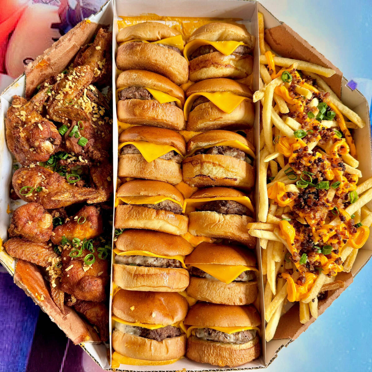 A Caixa acompanha uma generosa porção de Nuggets, regado a cheddar e bacon, e cebolinha para dar o toque final. 4 deliciosas metades de mini lanches, no pão brioche, hamburguer feito de carne angus, com cheddar, ketchup e maionese da casa.