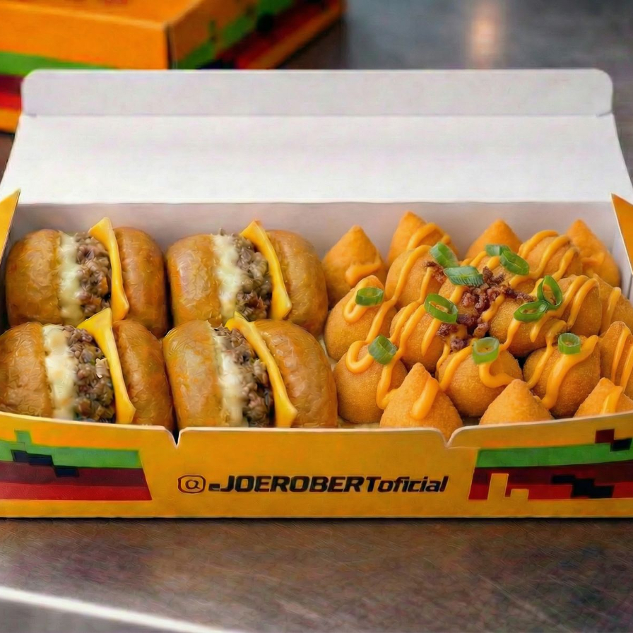 A Caixa acompanha uma generosa porção de Coxinha de frango artesanal regada a cheddar e bacon, e cebolinha para dar o toque final. 4 deliciosas metades de mini lanches, no pão brioche, hamburguer feito de carne angus, com cheddar, ketchup e maionese da casa.