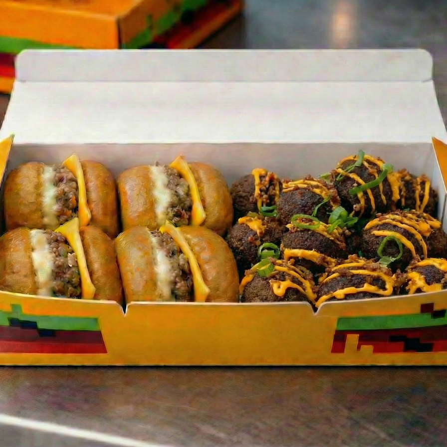 Oito metades de mini lanches, feitos com carne Angus em uma caixa de pizza brotinho. Acompanha uma generosa porção com 10 bolinhos de carne angus fritos, polvilhados com uma irresistível farofa de bacon. Para completar, todas essas delícias são mergulhadas por um cremoso e saboroso cheddar, criando uma combinação perfeita e irresistível para até duas pessoas. Não enviamos itens separadamente.