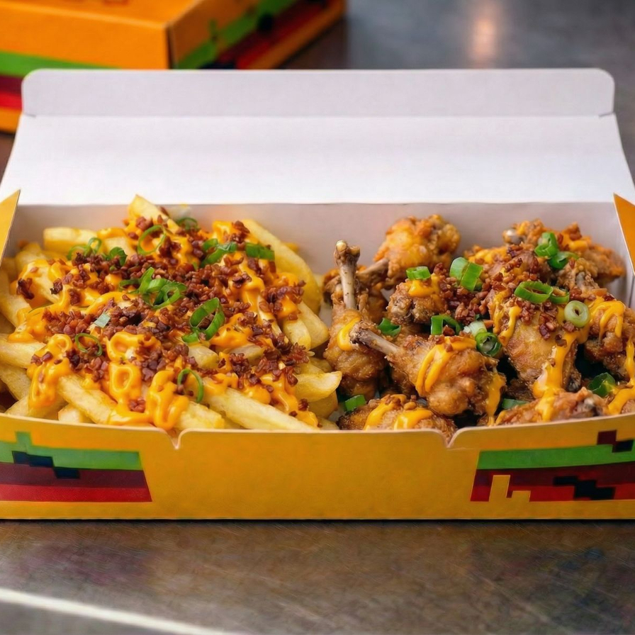 Oito metades de mini lanches, numa caixa de pizza brotinho, feitos com carne Angus. Acompanha 4 coxas de frango apimentadas empanadas e crocantes, polvilhadas com uma irresistível farofa de bacon. Para completar, todas essas delícias são mergulhadas por um cremoso e saboroso cheddar, criando uma combinação perfeita e irresistível para até duas pessoas. Não enviamos itens separados.