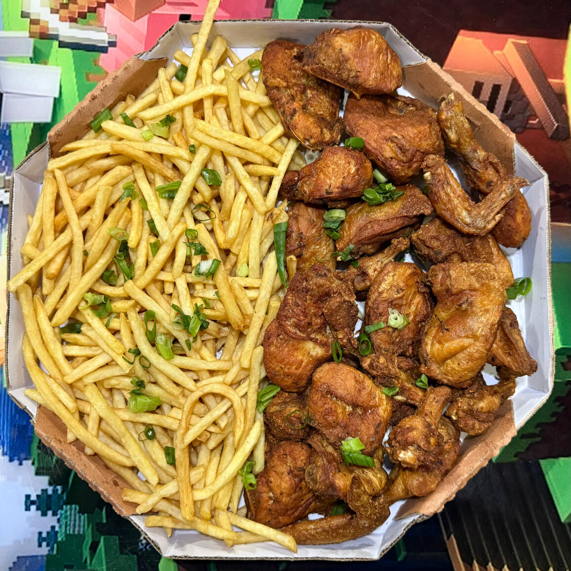 Porção para até duas pessoas de frango a passarinho e fritas (aproximadamente 600g)