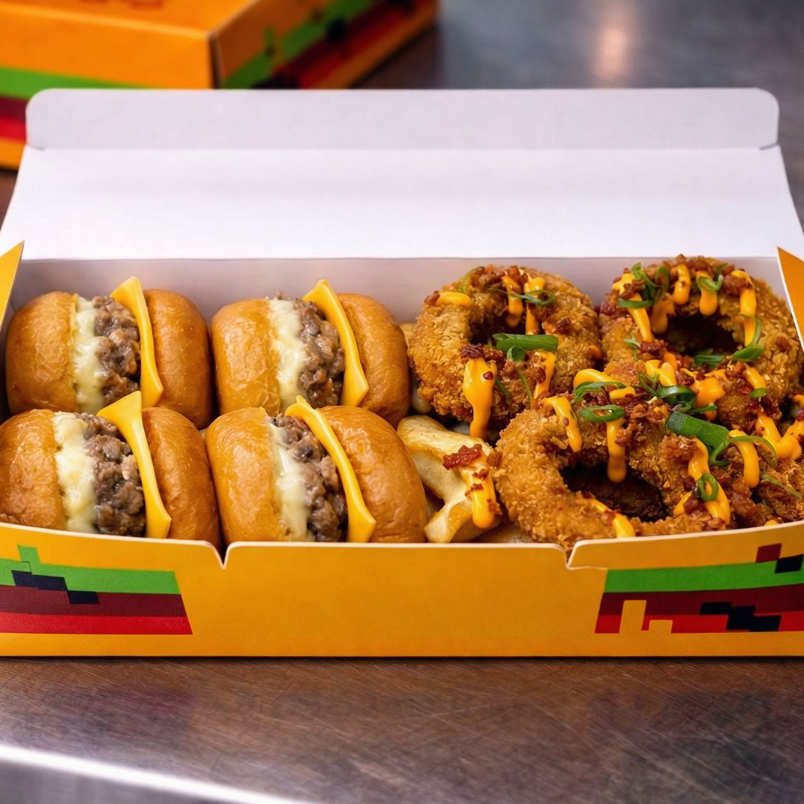 Feito em uma caixa de pizza brotinho, oito metades de mini lanches, feitos com carne Angus. Acompanha uma porção de Onion Rings crocantes, polvilhadas com uma irresistível farofa de bacon. Para completar, todas essas delícias são mergulhadas em um cremoso cheddar, criando uma combinação perfeita e irresistível para até duas pessoas. Atenção, não enviamos itens a parte.