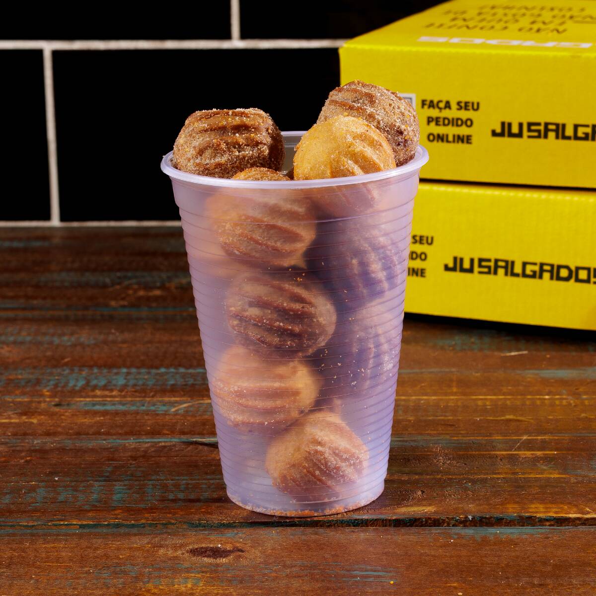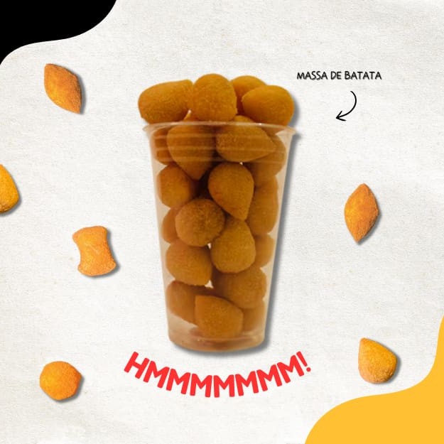 Nosso copo vem 12 salgadinhos (tamanho festa) feito com massa de batata, muito crocantes e sequinhos.