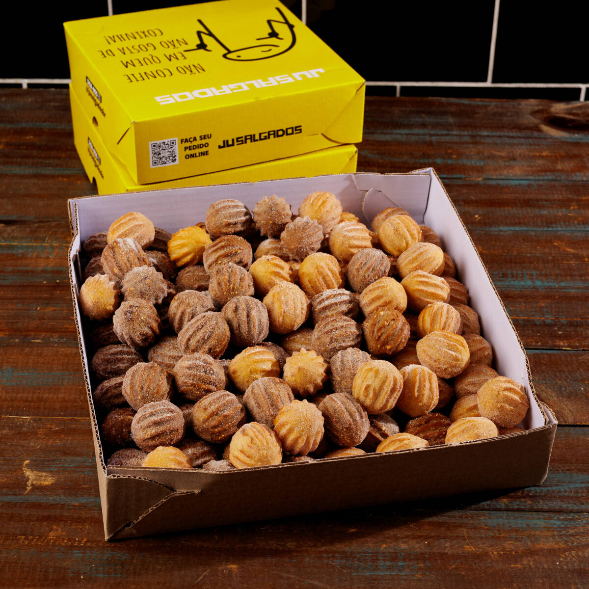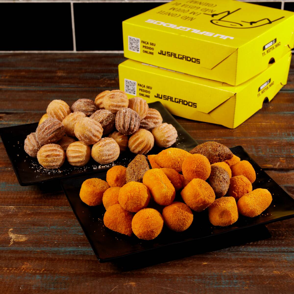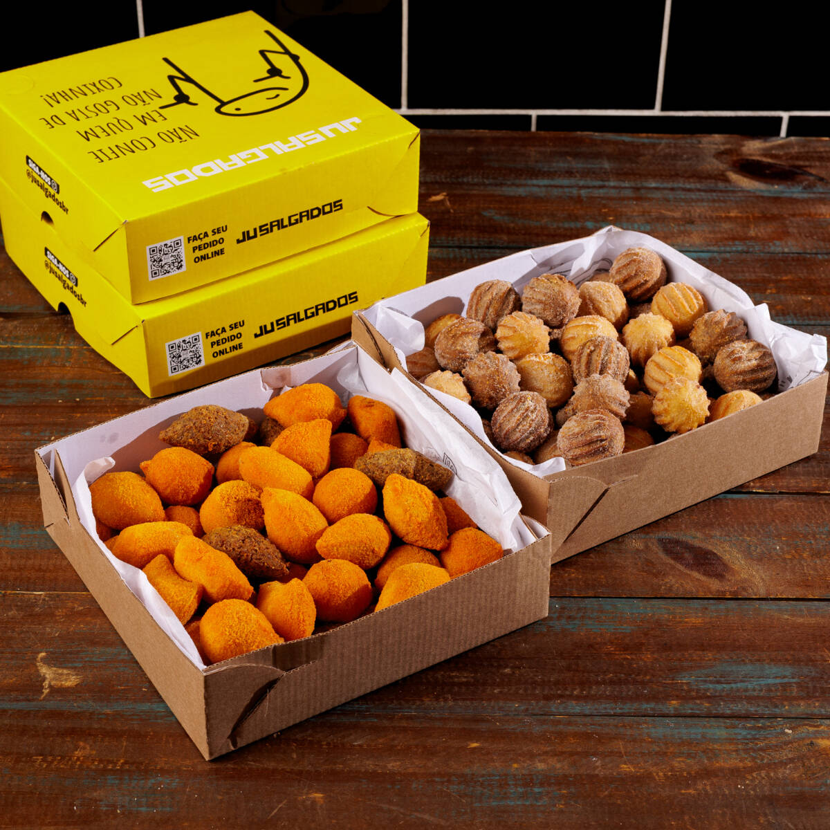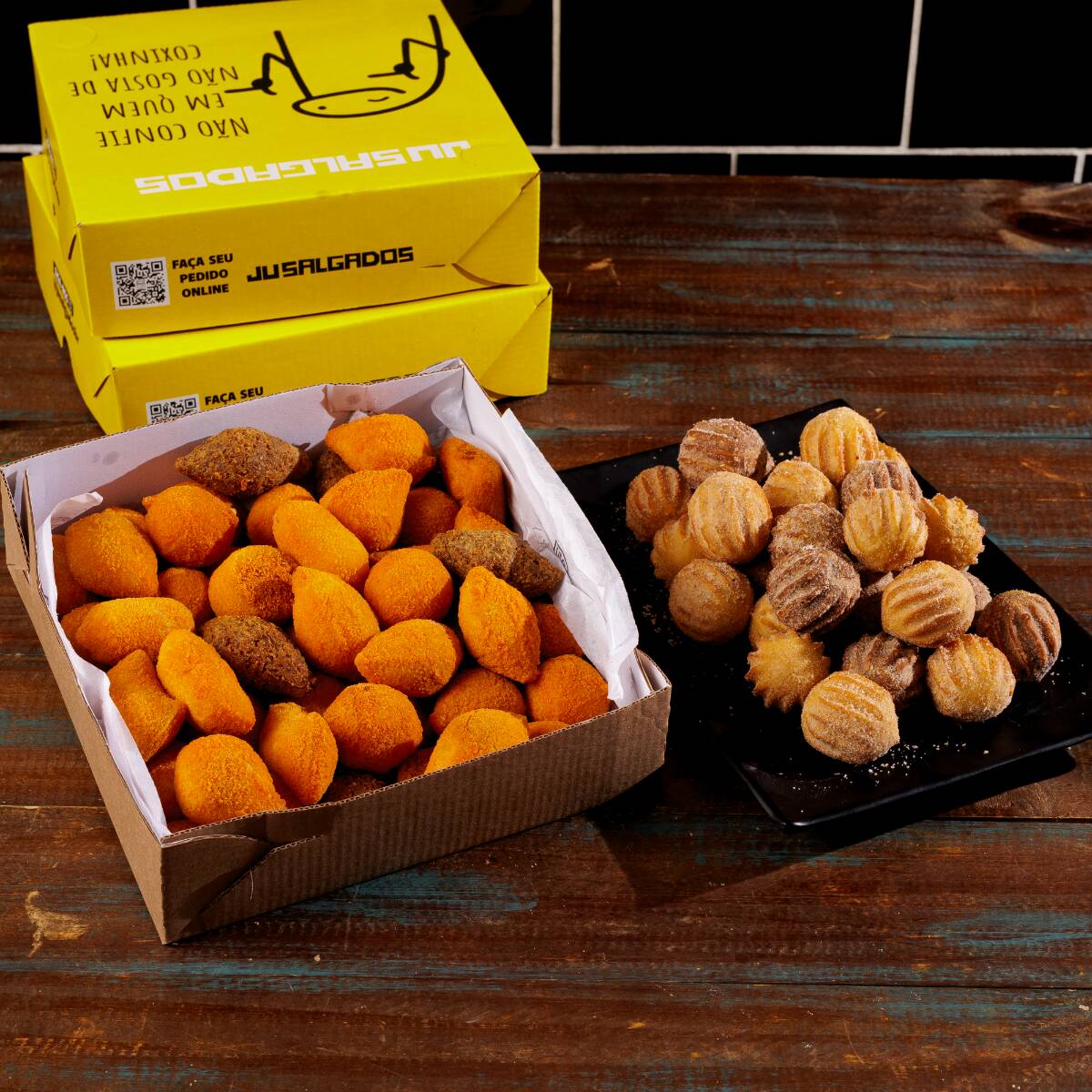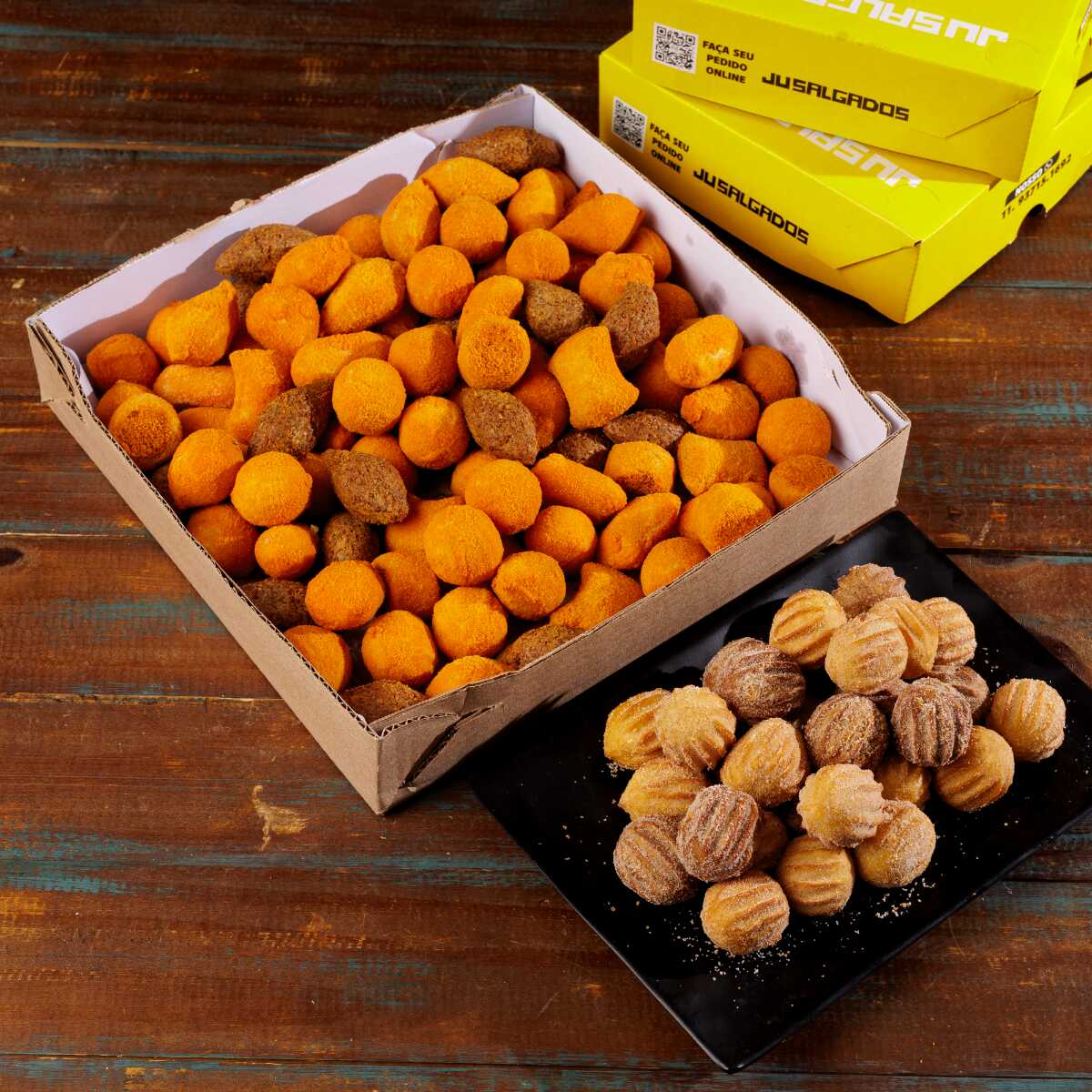 O combo perfeito! 50 Mini salgados de massa de batata sequinhos e saborosos + 50 mini churros douradinhos, polvilhados com açúcar e canela. Uma combinação irresistível de salgado e doce.
