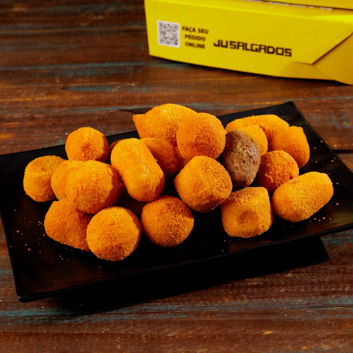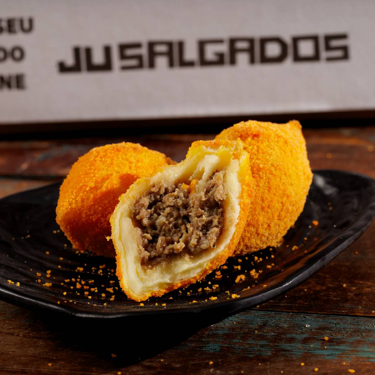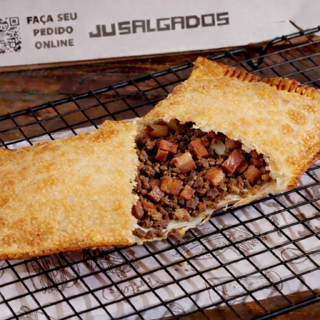 Nosso bolinho de carne agora em tamanho maior (60g)! Massa macia e saborosa, recheada com carne temperada e suculenta, finalizada com empanado crocante e dourado.