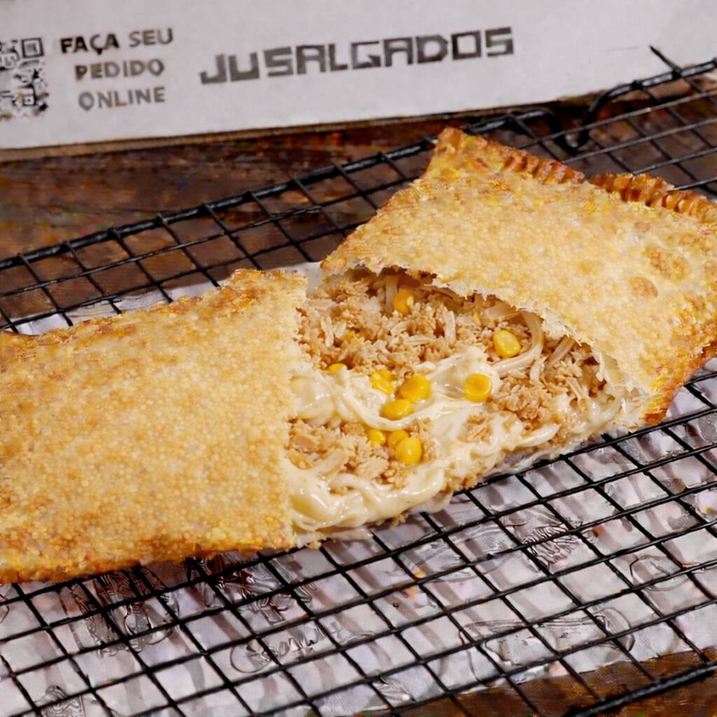 Nossa tradicional coxinha agora em tamanho maior (60g)! Massa macia e saborosa, recheada com frango temperado e suculento, finalizada com empanado crocante e dourado.