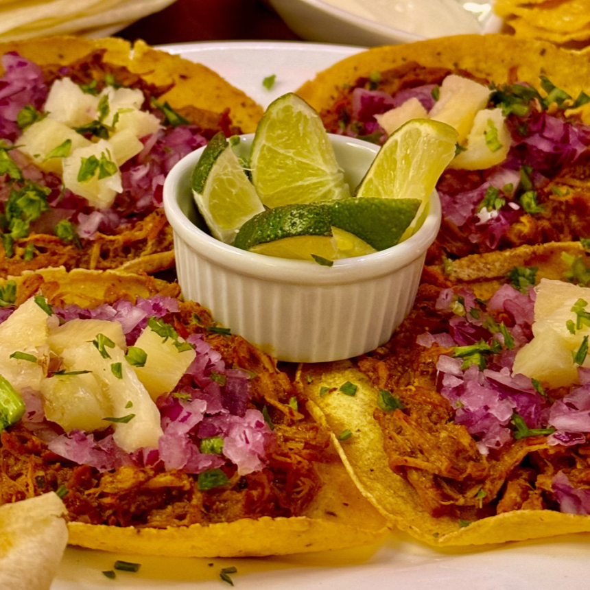 O taco al pastor é um prato mexicano popular, conhecido por sua carne de porco marinada servida com cubos de abacaxi em uma tortilha macia de milho.