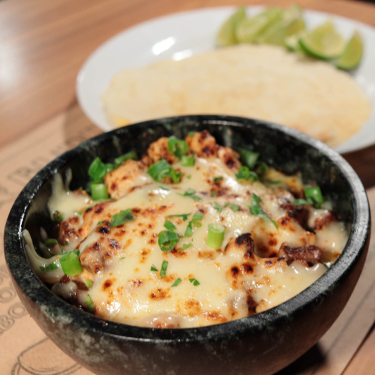 Um saboroso molcajete (tiras de alcatra e filé, molho de carne, cebola, pimentão, coberto com queijo) com seis tortillas mexicana pra você montar e interagir