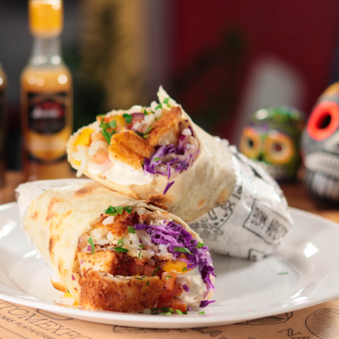 Tortilla grande macia de trigo, queijo derretido, proteína de escolha, Base do burrito composta de guacamole, sour cream e fritas palito.
