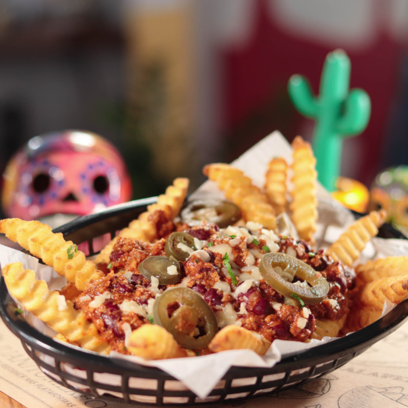 Porção média de batata coberta com chilli de proteina de soja, mussarela e jalapeno.