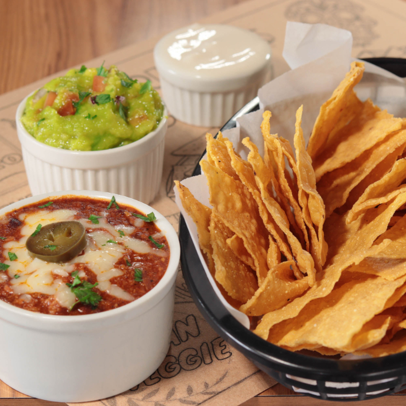 Porção média de nachos sequinhos e crocantes. Acompanhada de molho chilli de proteína de soja 120ml, molho guacamole 110ml e molho sour cream 110ml e pimenta jalapeño opcional.