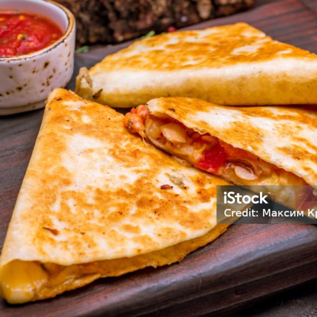 Suculenta mega quesadilla partida em quatro pedaços com o recheio a sua escolha, uma bebida, e acompanhada de nachos e um molho.