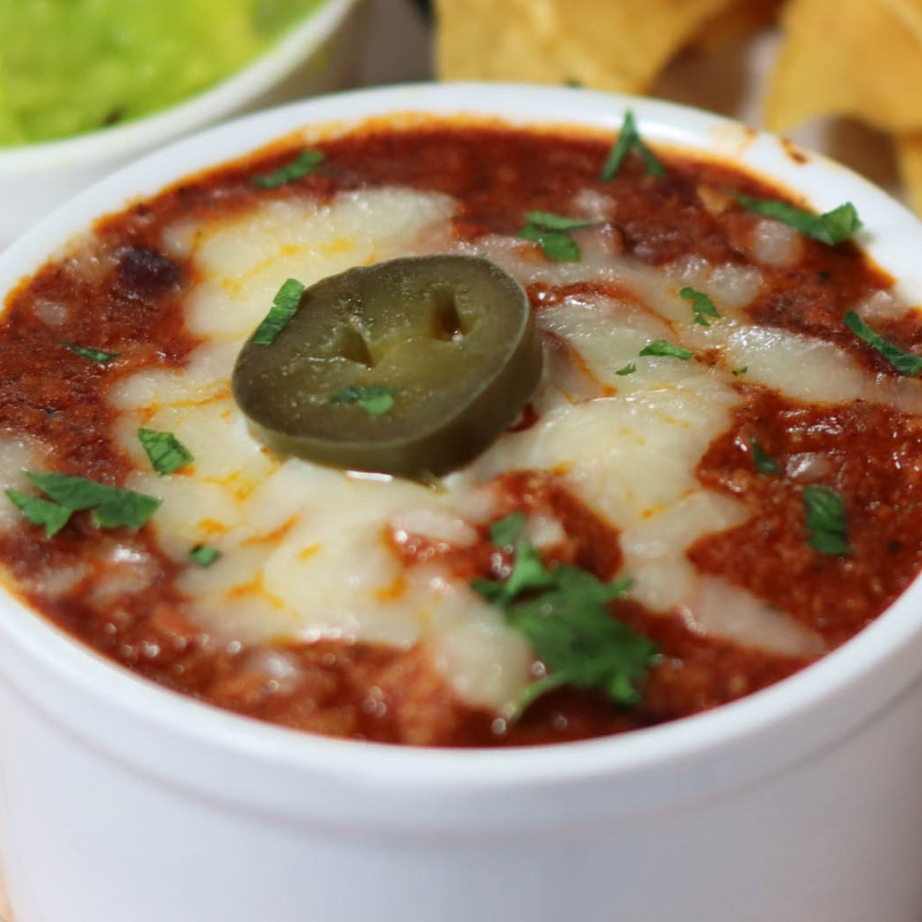 Porção média de batata coberta com chilli de carne, mussarela e jalapeno.