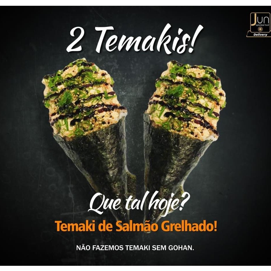 Salmão grelhado, com cream cheese, tarê, cebolinha e gergelim. Não fazemos sem arroz. Não acompanha hashi, shoyu e nem tare. Peso aproximadamente de cada temaki 150 gr.