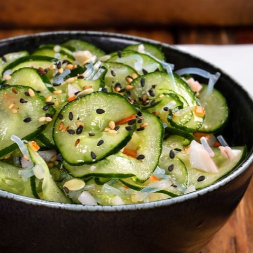 Lâminas de pepino oriental levemente adocicadas, finalizadas com harusame e gergelim.
