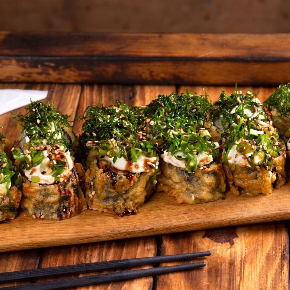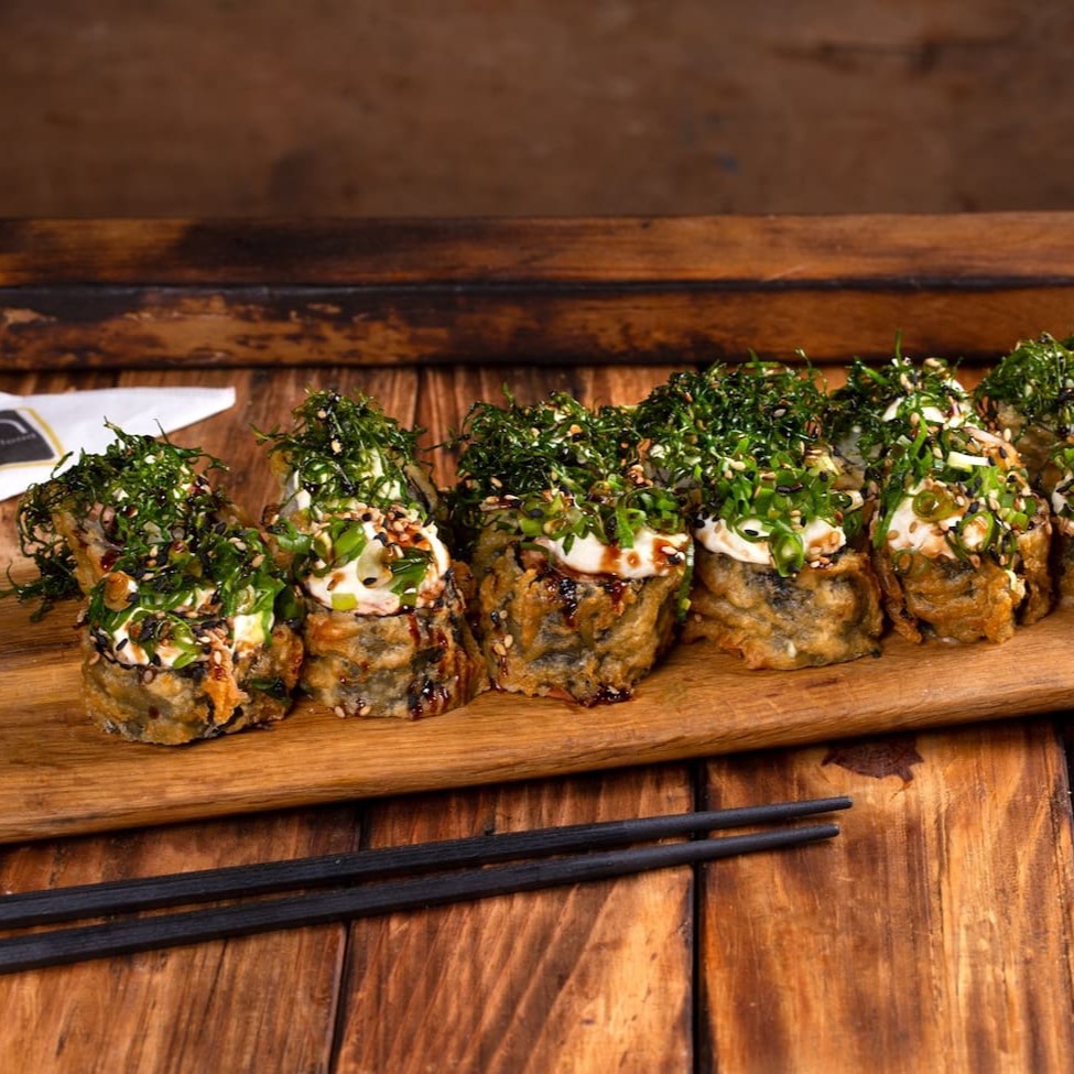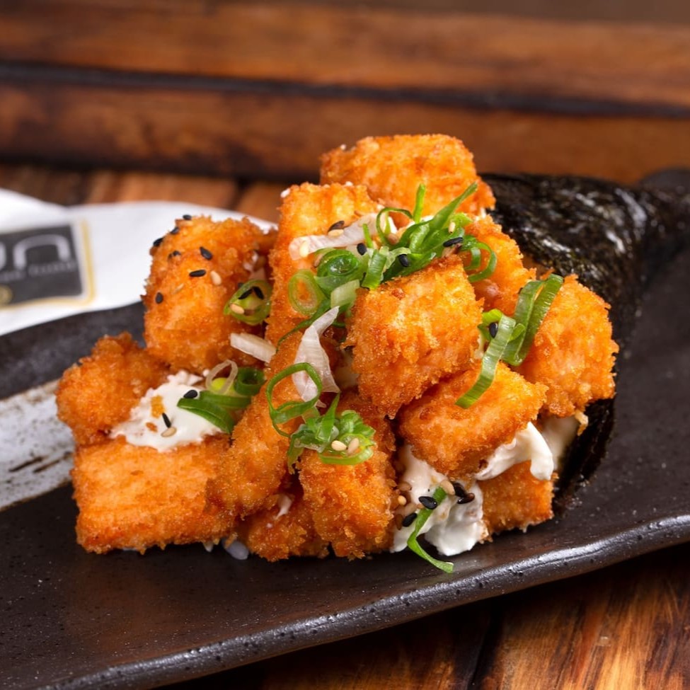 Nosso temaki de salmão empanado e frito, finalizado com tarê, cream cheese e couve crispy (aproximadamente 300g).