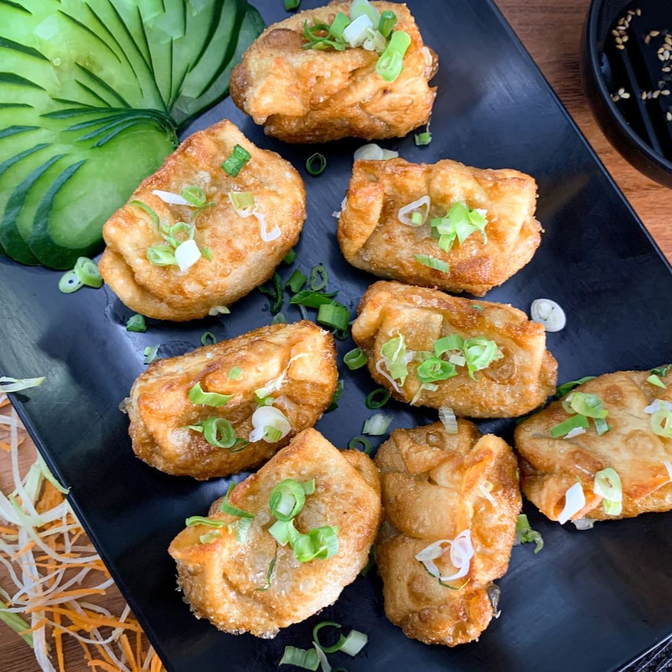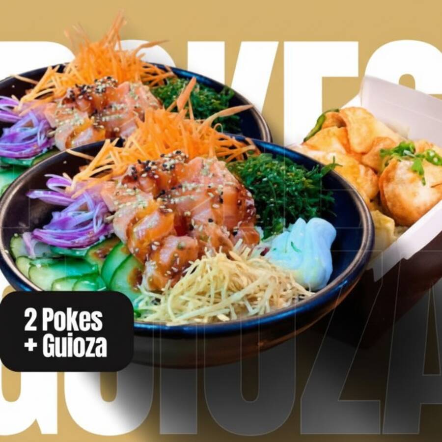 2 Pokes de Salmão cru, com base de arroz japonês, cream cheese, couve crispy, sunomono, cebolinha e crispy de batata doce! Acompanha uma porção de guioza (8 unidades)