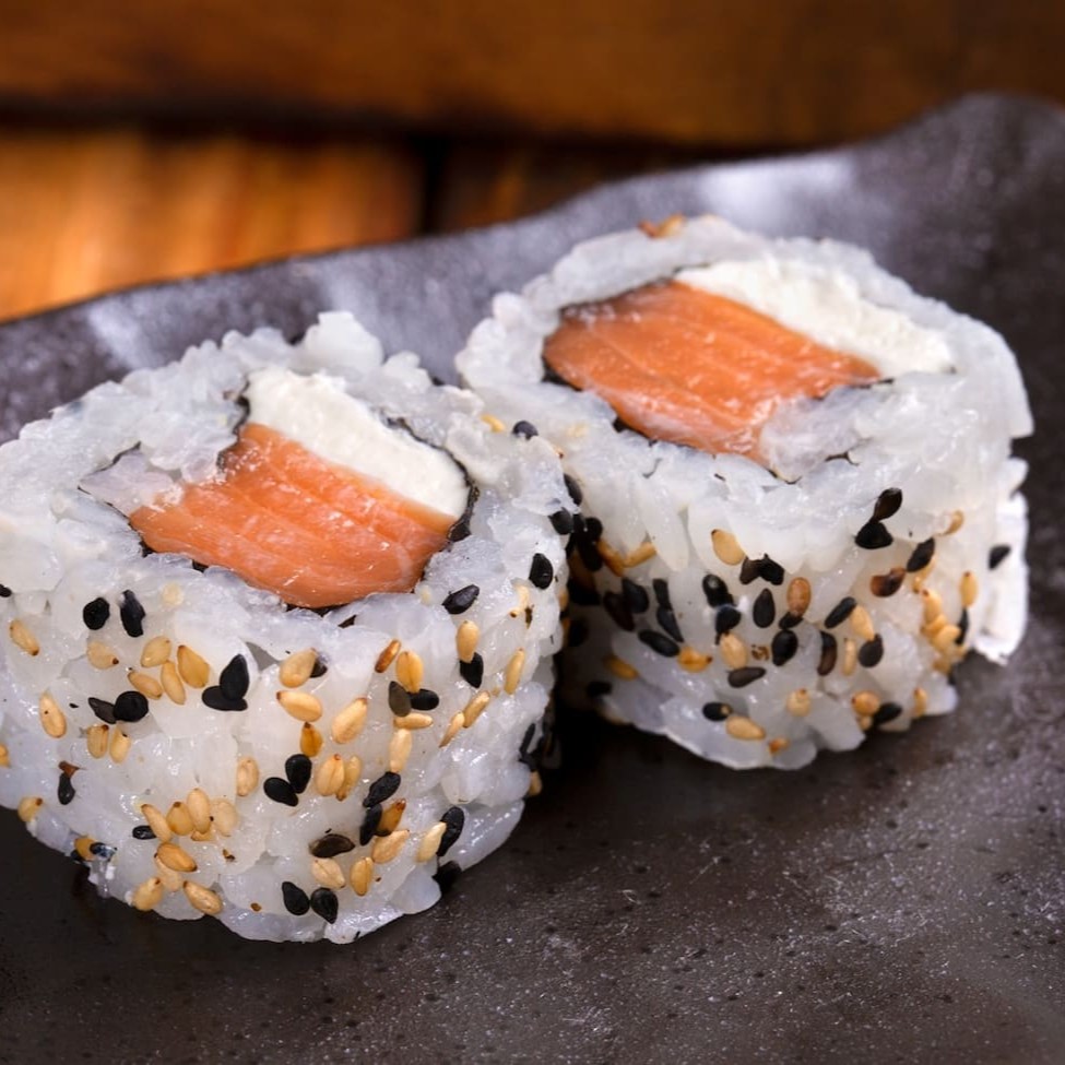 Temaki de salmão grelhado com cream cheese, cebolinha e gergelim de aproximadamente 220g. Não Fazemos Temaki Sem Arroz.