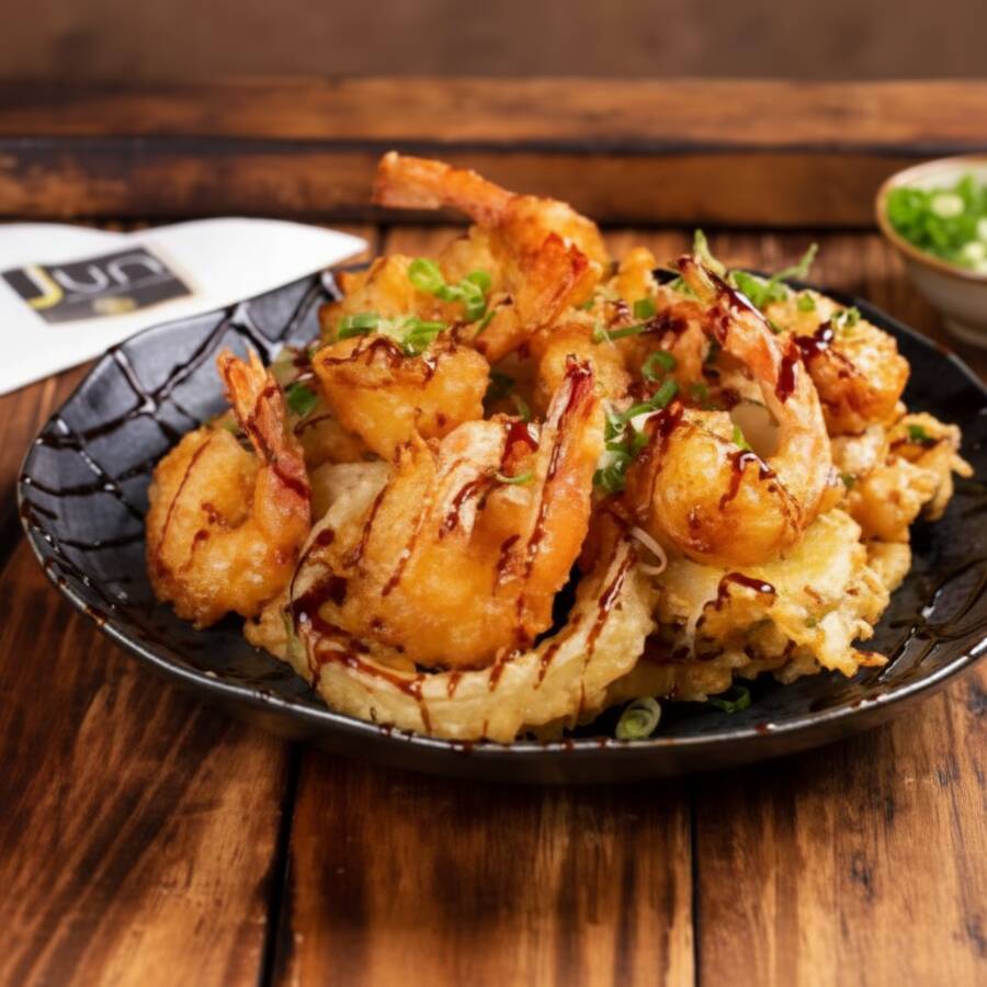 Uma massa leve sequinha e dourada, feita com farinha especial importada, . Seja de legumes ou camarão, o tempurá é um prato clássico da culinária japonesa Aprox. 22 camarões