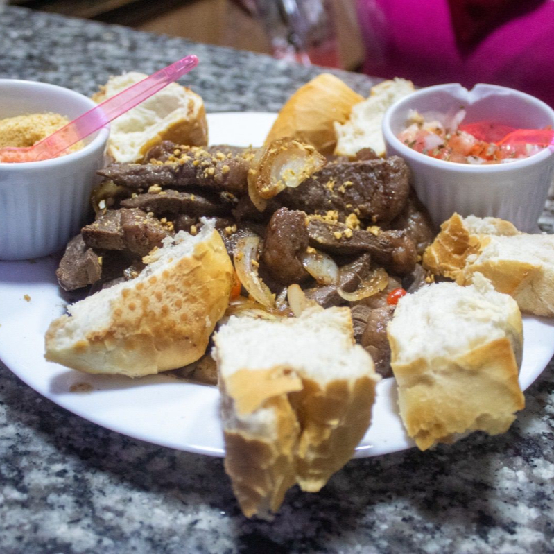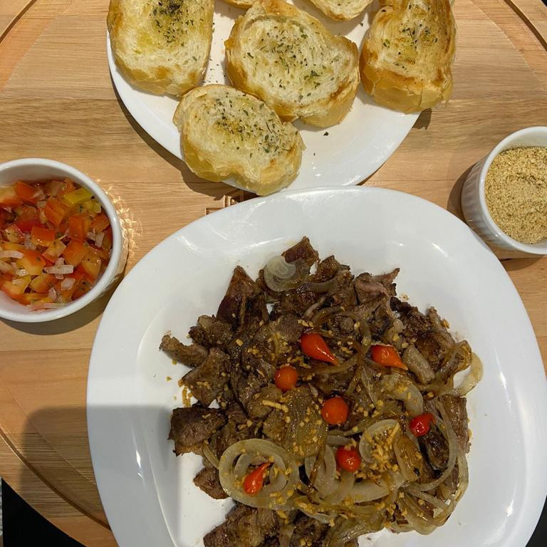 CONTRA FILÉ EM TIRAS, ACEBOLADO, DECORADO COM PIMENTA BIQUINHO. ACOMPANHA PORÇÃO DE PÃES, VINAGRETE E FAROFA.