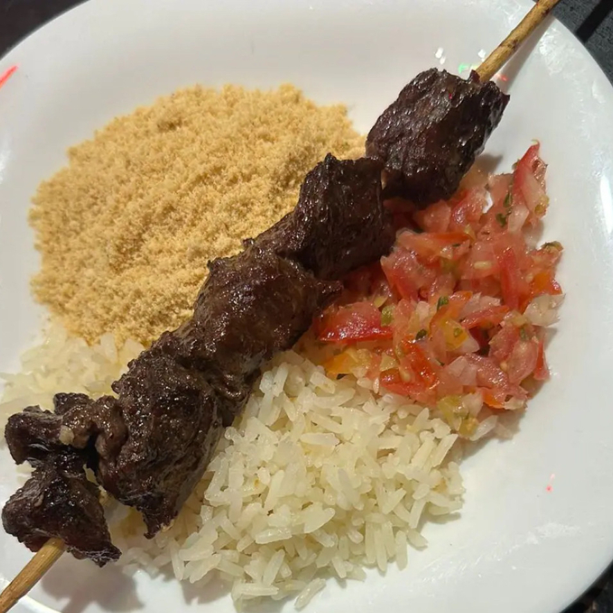1 espeto , arroz , farofa e vinagrete