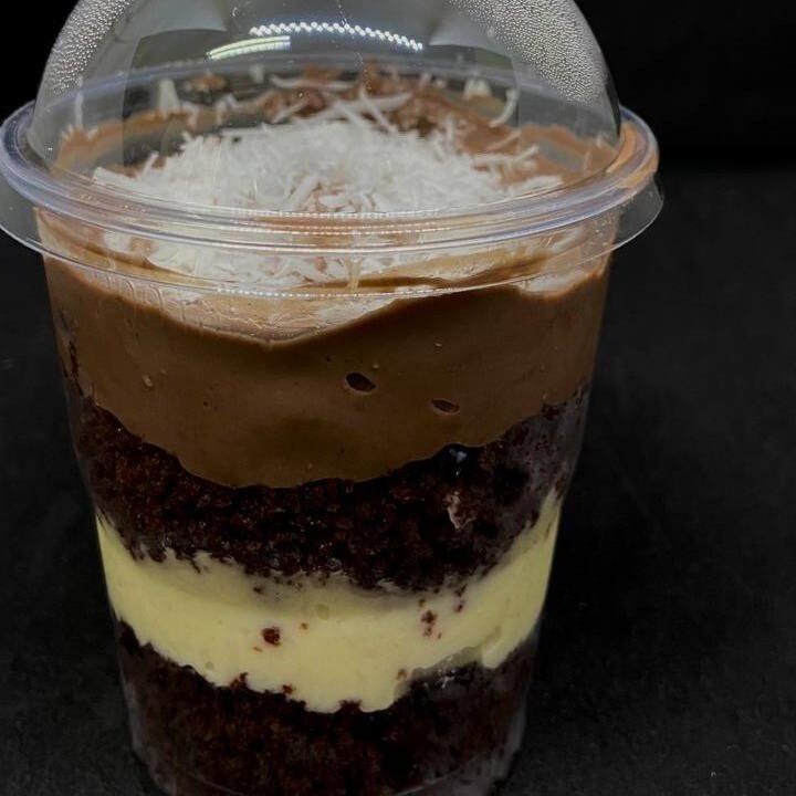 Delicioso bolo no pote com recheio de Prestígio e cobertura de chocolate com coco