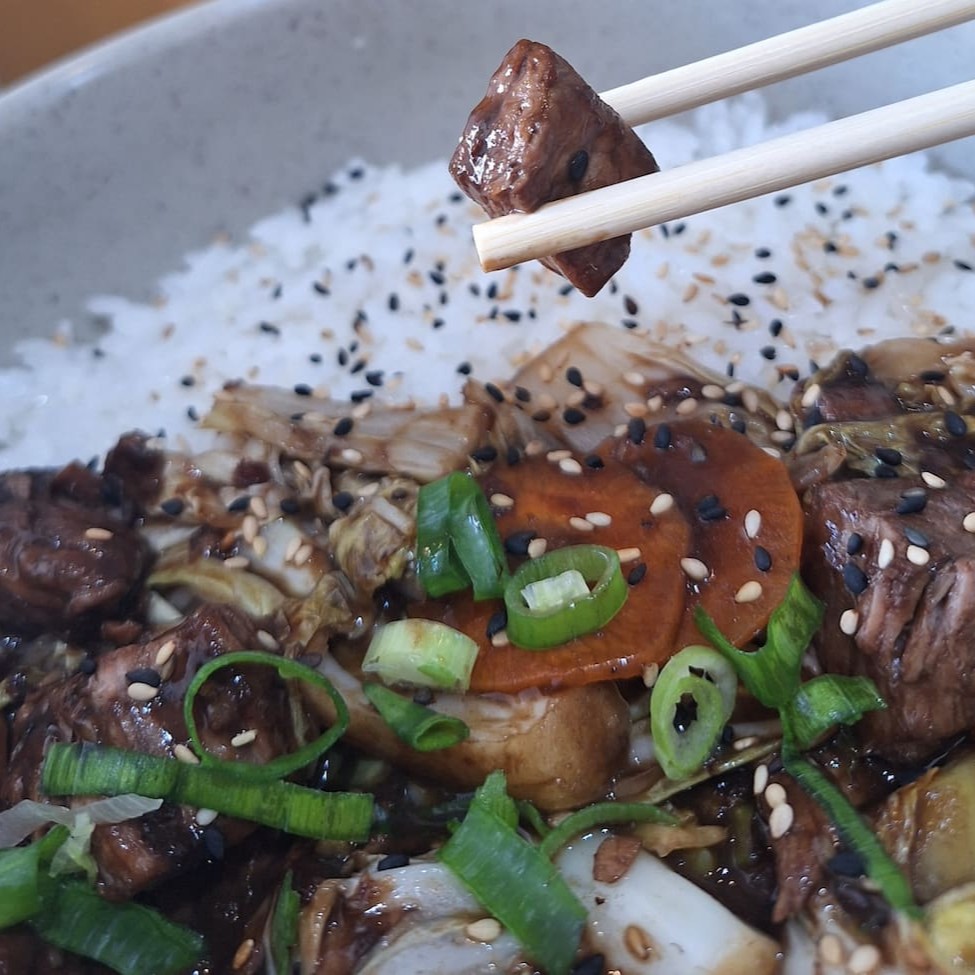 Servido com arroz japones (gohan), carne macia e suculenta salteada com legumes cozidos e finalizada com um delicioso molho teriaky feito na casa.