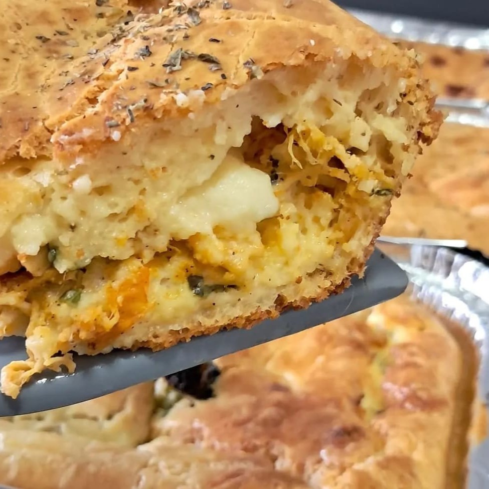 Massa leve e dourada, recheada com frango desfiado temperado na casa e requeijão cremoso. Uma torta clássica e cheia de sabor.