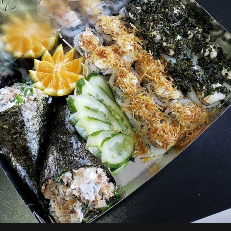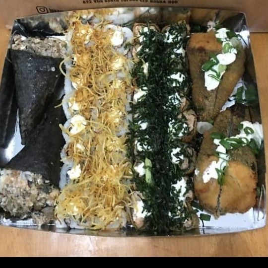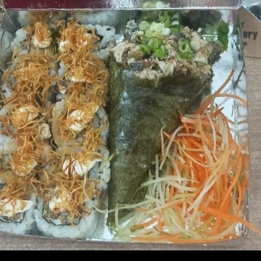 Arroz,atum em cubos,shimeji,sunomonu,manga,tomate cereja,cebola roxa,batata frita,couve frita,cebolinha,gengibre,cream cheese,genilim. Não alteramos itens.