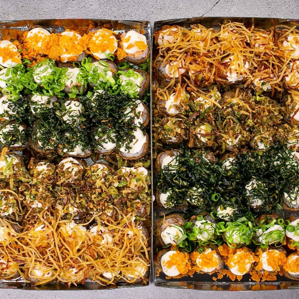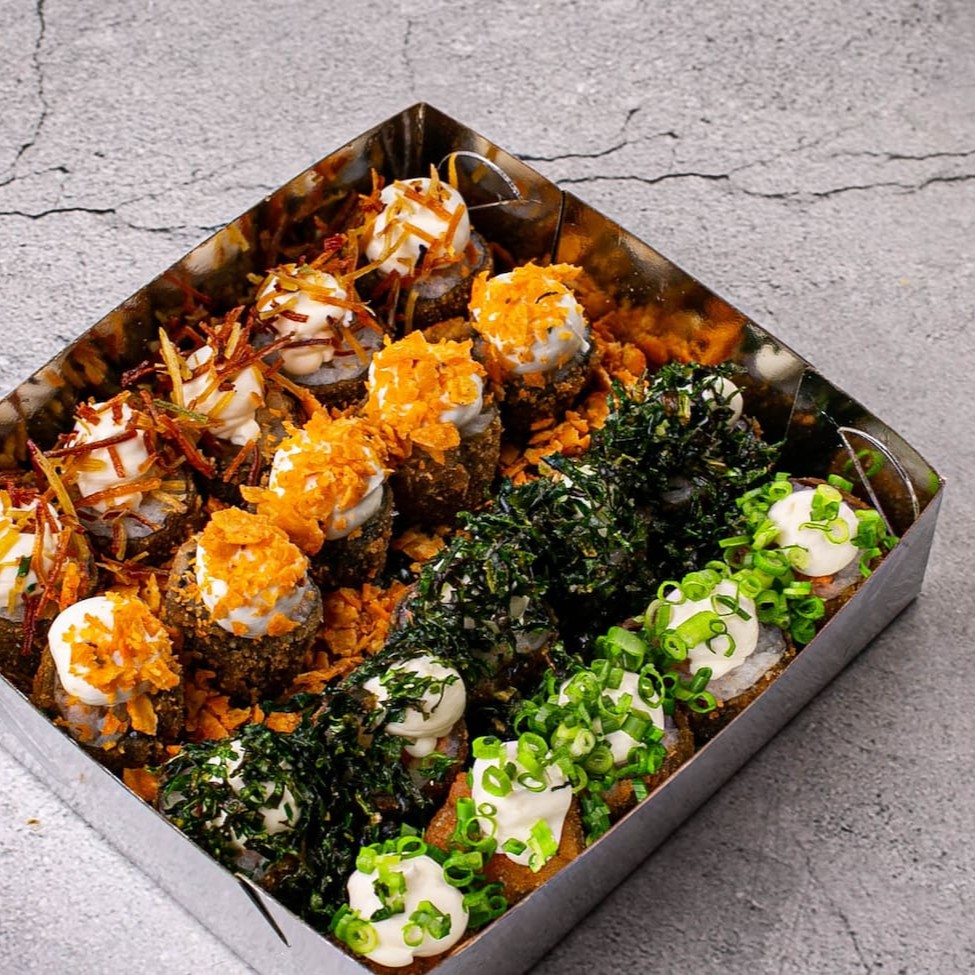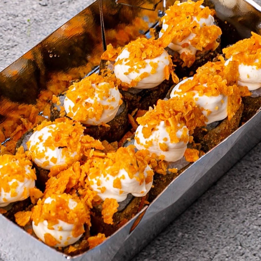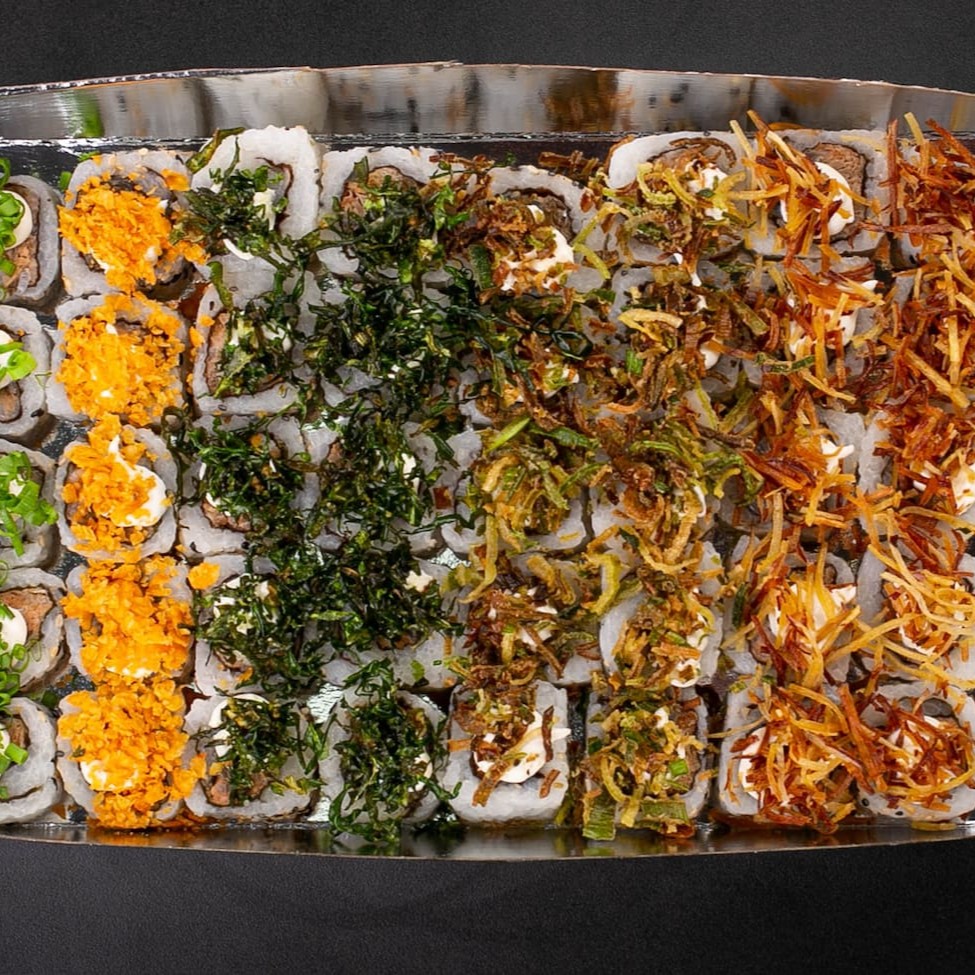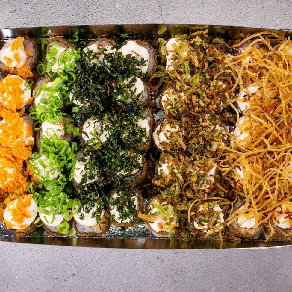 5 uramaki com Doritos, 5 uramaki com couve crispy, 5 uramaki com batata crispy, 5 uramaki com cream cheese e cebolinha