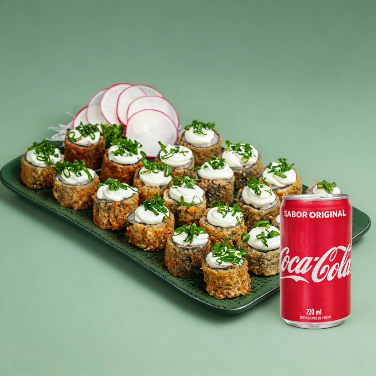 Suculento temaki, 6 Hot-roll super crocante e uma Coca-Cola geladinha (220ml).