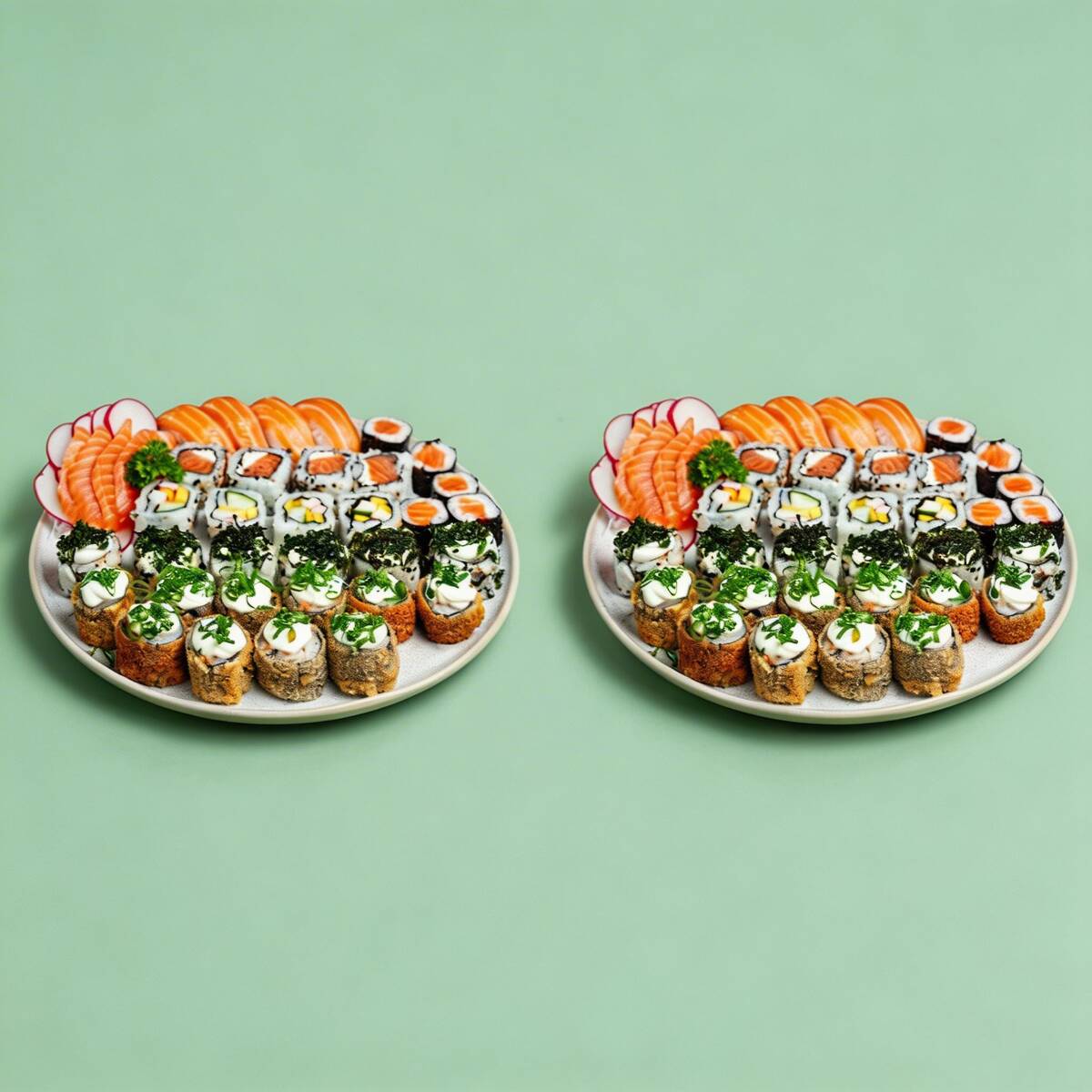 Aquele combo pra galera toda saborear! 12 sashimis salmão, 6 sashimis atum, 6 sashimis peixe branco, 8 niguiris salmão, 4 niguiris atum, 4 niguiris peixe branco, 4 hossomakis salmão, 4 uramakis salmão, 4 jhows salmão, 4 hot holls e 4 hot rolls com couve Só salmão ou mix de peixes.