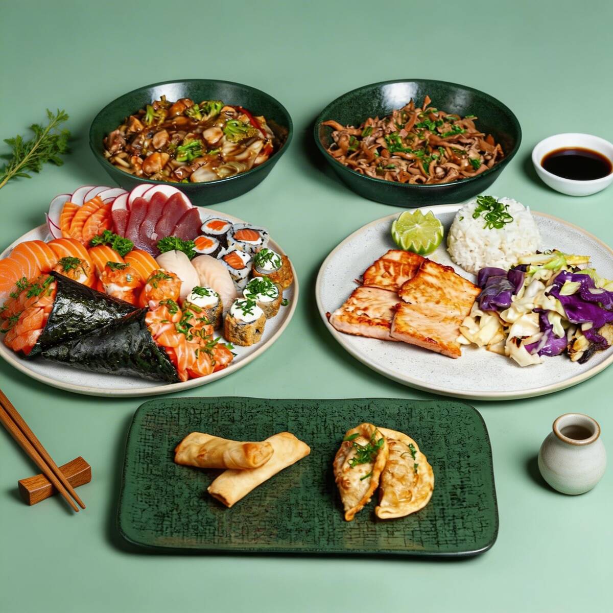 100g salmão grelhado (acompanha gohan e legumes), 100g yakisoba misto, 100g shimeji, 2 guiozas bovinas, 2 harumakis queijo, 2 temakis salmão, 4 sashimis salmão, 4 sashimis atum, 4 jhows salmão, 4 hot rolls, 2 hossomakis salmão, 2 uramakis salmao, 4 niguiris salmao, 2 niguiris peixe branco