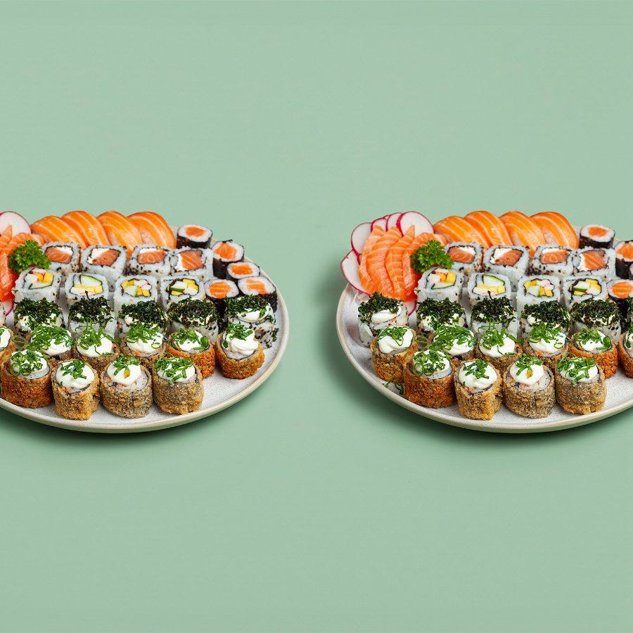 5 sashimis salmão, 4 niguiris salmão, 4 uramakis salmão, 5 hossomakis salmão, 6 uramakis califórnia, 6 uramakis skin com couve, 5 hot rolls e 5 hot rolls com couve *este item é padrão e não pode ser alterado* **imagem meramente ilustrativa**