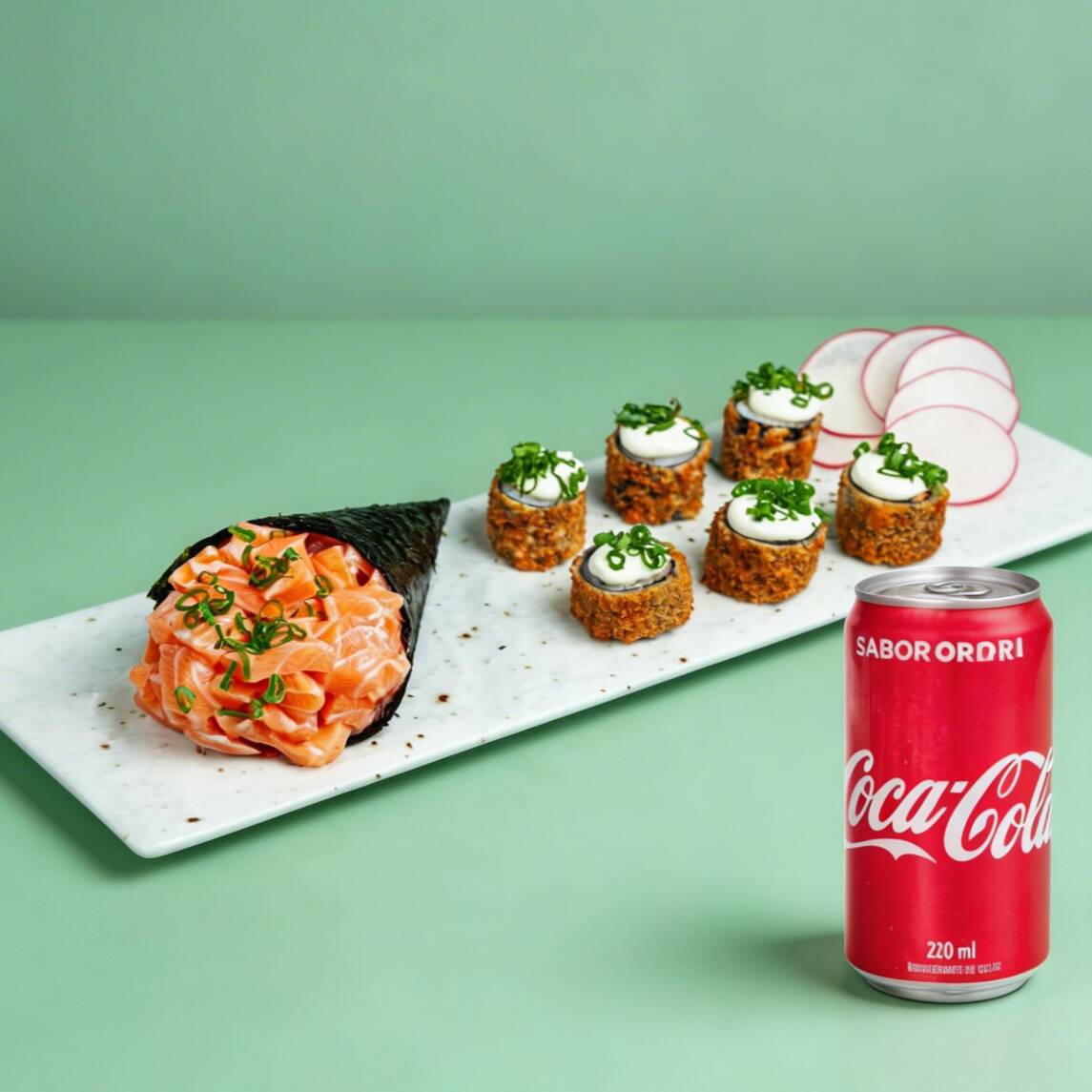 Suculento temaki, 6 Hot-roll super crocante e uma Coca-Cola geladinha (220ml).