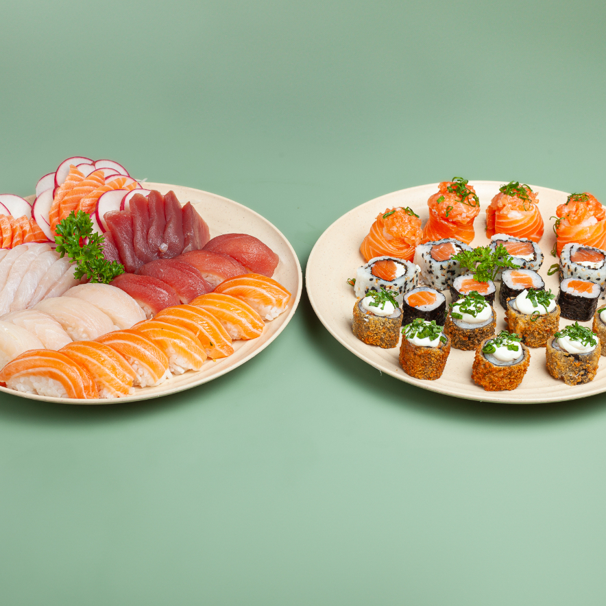 6 sashimis salmão, 3 niguiris salmão, 3 uramakis salmão, 3 uramakis kani , 3 uramakis skin com couve, 6 hot rolls e 4 hot rolls com couve *os itens não podem ser alterados*