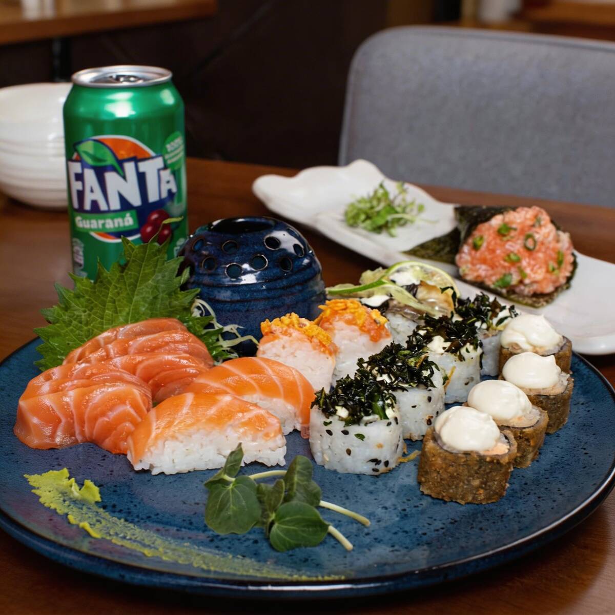 10 sashimi salmão, 4 niguiri salmão, 4 uramaki skim, 2 baterás 4 hot holls, 2 uramakis salmão 6 niguiris skim 2 temaki de salmão 1 refrigerante