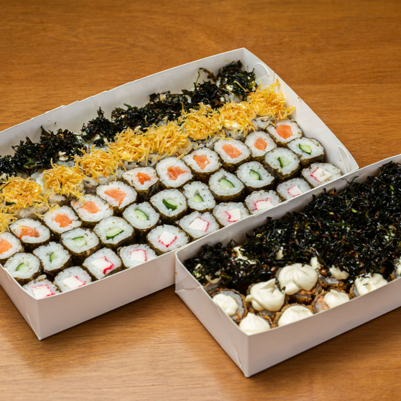 10 hossomaki de salmão / 10 hossomaki pepino/ 10 uramaki skin com couve crispy/ 5 Uramaki Skin com batata crispy/ 5 uramaki california/ 10 Kapamaki / 30 Hot Roll.