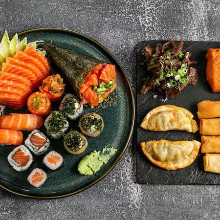 6 sashimi de salmão 6 sashimi de tilápia 4 uramaki de salmão 4 jhou de salmão 4 hossomaki de salmão 2 niguiri de salmão 8 hot holl 2 temaki de salmão completo 2 gyoza bovina 2 harumaki de queijo 2 croquete de salmão 2 camarão recheado com Catupiry 2 salmão grelhado com legumes 1 porção de sunomono 1 porção de shimeji (sem alteração)
