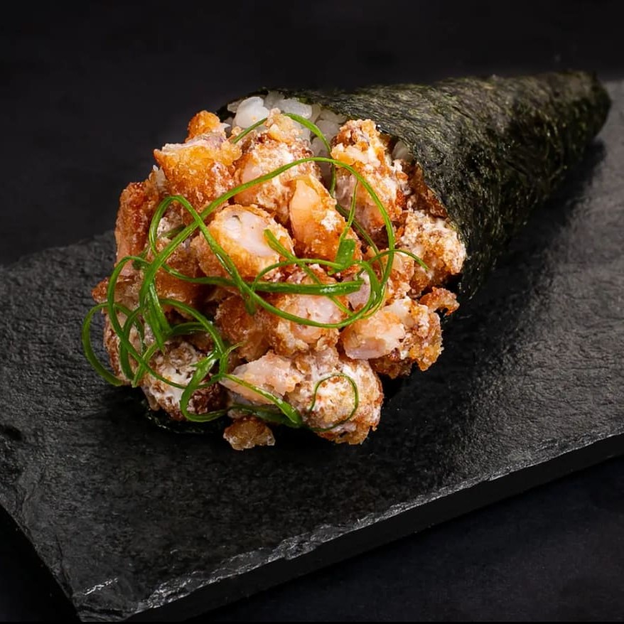 Enrolado com salmão grelhado e empanado em uma farinha crocante depois de frito, finalizado com couve e tarê. (sem alteração)