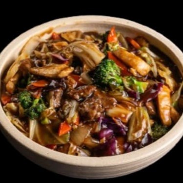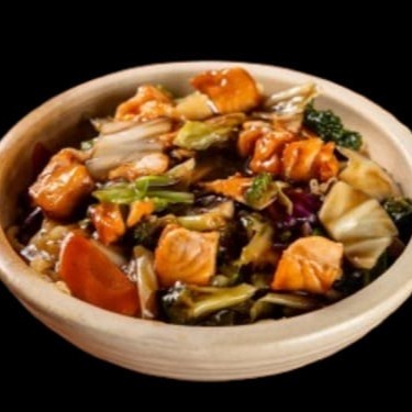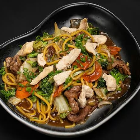 Legumes refogados com molhos orientais, frango e carne. (sem alteração)
