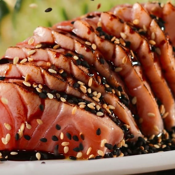 Esse prato vai 8 unidades de cortes finos de sashimi de salmão. finalizado com molho taré e gergelim .