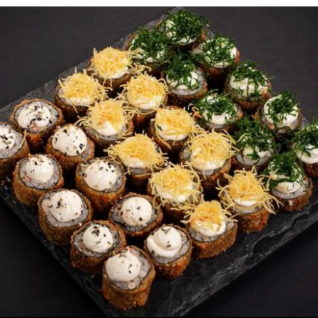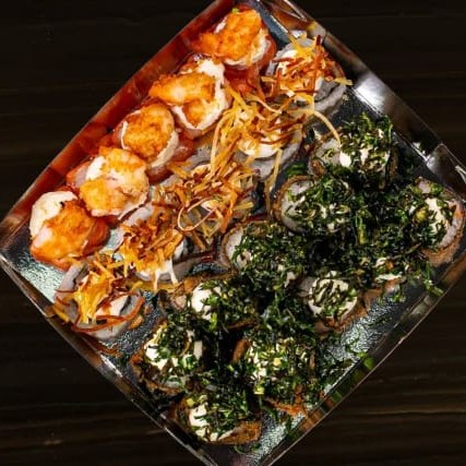 6 Jhou com maracujá 6 Hot holl Doritos 5 Niguiri do chef 5 Sashimi de salmão * todos maçaricados (sem alteração)