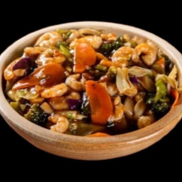 Legumes refogados com molhos orientais, macarrão oriental e camarão. (sem alteração)