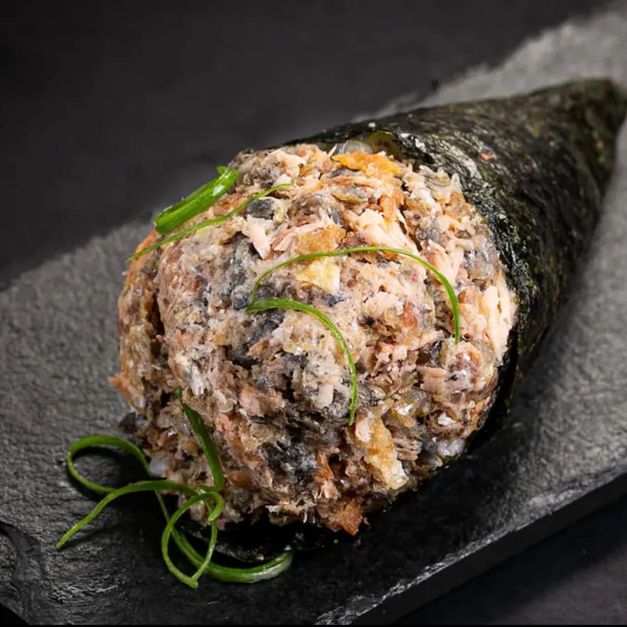 Enrolado em uma folha de alga marinha, recheada com arroz e salmão. (sem alteração)