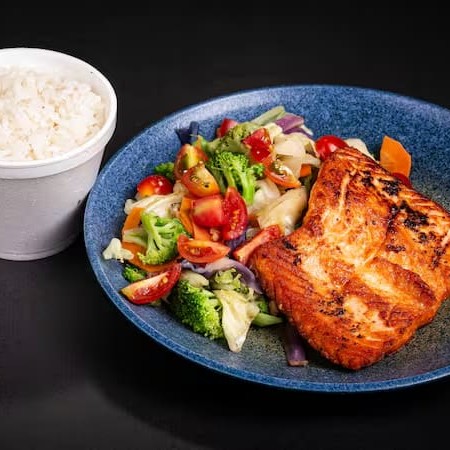Salmão grelhado na chapa acompanha legumes refogado e arroz japonês gorran